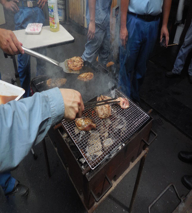 突然の大雨! テントの中、雨と暑さに負けずお肉を焼き続けてくれました。感謝!